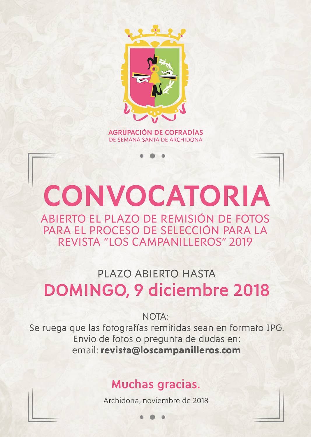 La Agrupación de Cofradías de Semana Santa de Archidona abre el plazo para remitir fotografías para el proceso de selección de la próxima edición de la revista «Los Campanilleros» 2019. Ruegan que las fotografías remitidas sean en formato JPG.