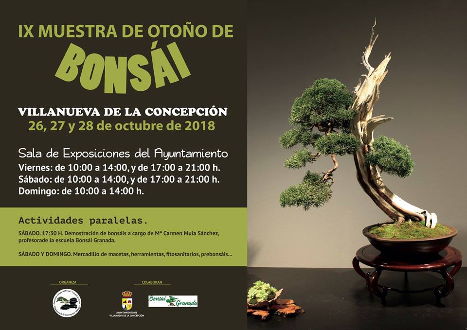 Desde este viernes al domingo Villanueva de la Concepción celebra su IX Muestra de Otoño de Bonsái. Será, como siempre, en la Sala de Exposiciones del Ayuntamiento. Este año, como actividades paralelas, habrá un mercadillo de macetas, herramientas, fitosanitarios, prebonsáis… y una demostración a cargo de Mª Carmen Mula Sánchez, profesora de la escuela Bonsái Granada, este sábado a las 17.30 horas.