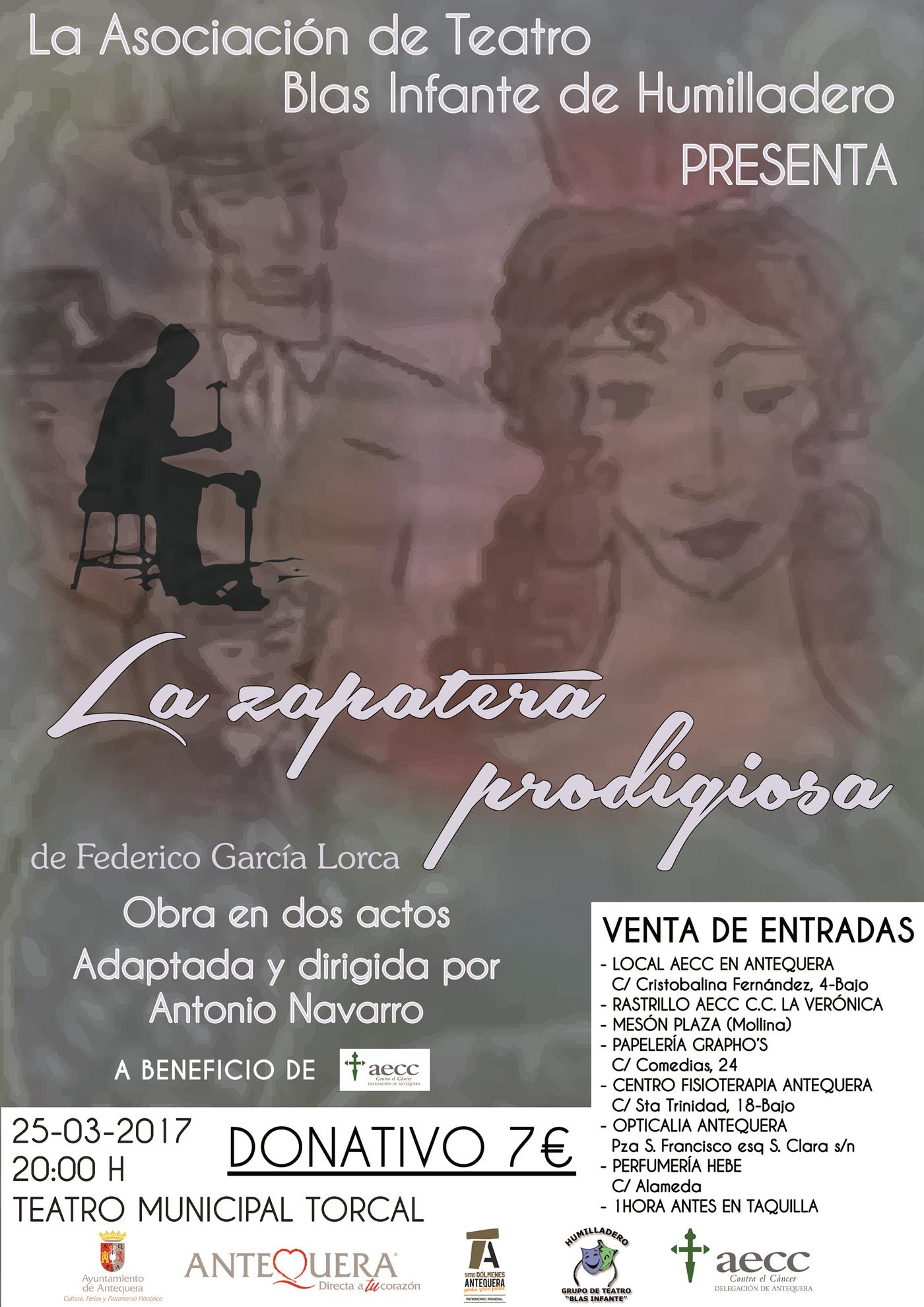 Donativo: 7 €, venta anticipada en la sede de la Asociación Española contra el Cáncer, Opticalia Antequera y Asociación Blas Infante. En taquilla del teatro una hora antes del comienzo de la función.