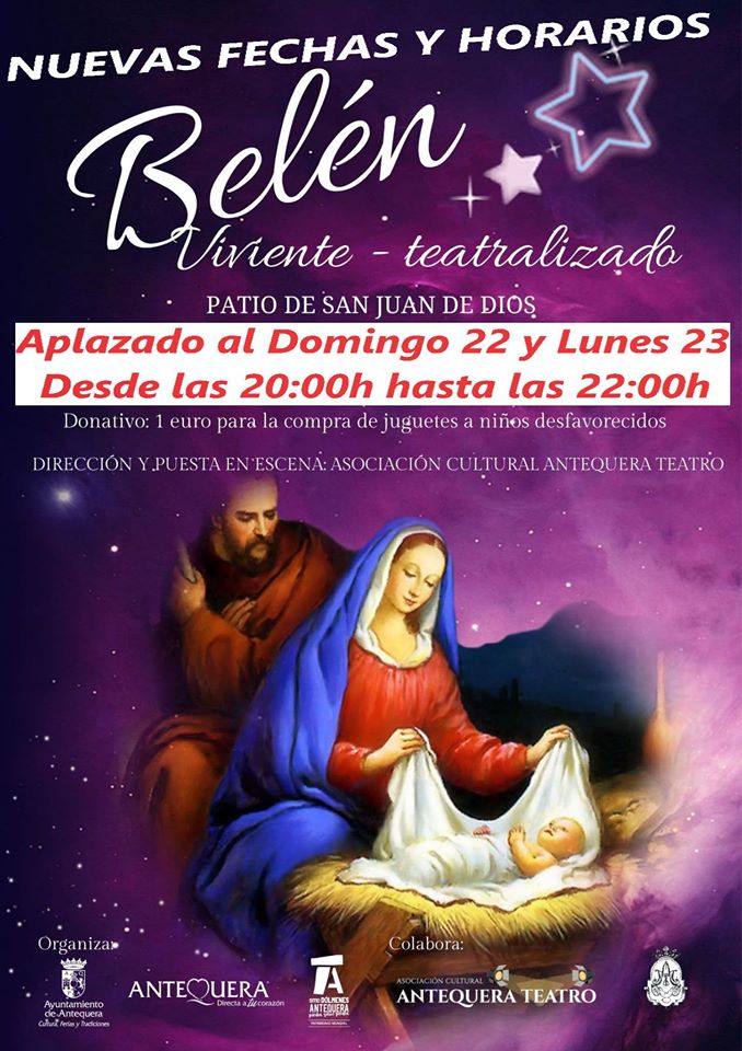 20.00 A 22.00 Belén Viviente Teatralizado. En el Patio de San Juan de Dios. Donativo 1 euro para la compra de juguetes a niños desfavorecidos. Dirige y puesta en escena Asociación Cultural Antequera Teatro.