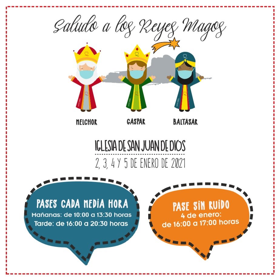 Durante el sábado 2, domingo 3, lunes 4 y martes 5 de enero. De 10.00 a 13.30 y de 16.00 a 20.30 horas, pases cada media hora. Los Reyes Magos estarán en el interior de la iglesia de San Juan de Dios, de 10.00 a 14.00 y de 16.00 a 21.00 horas para saludar a niños y niñas. Las invitaciones se podrán solicitar a través de giglon.com
