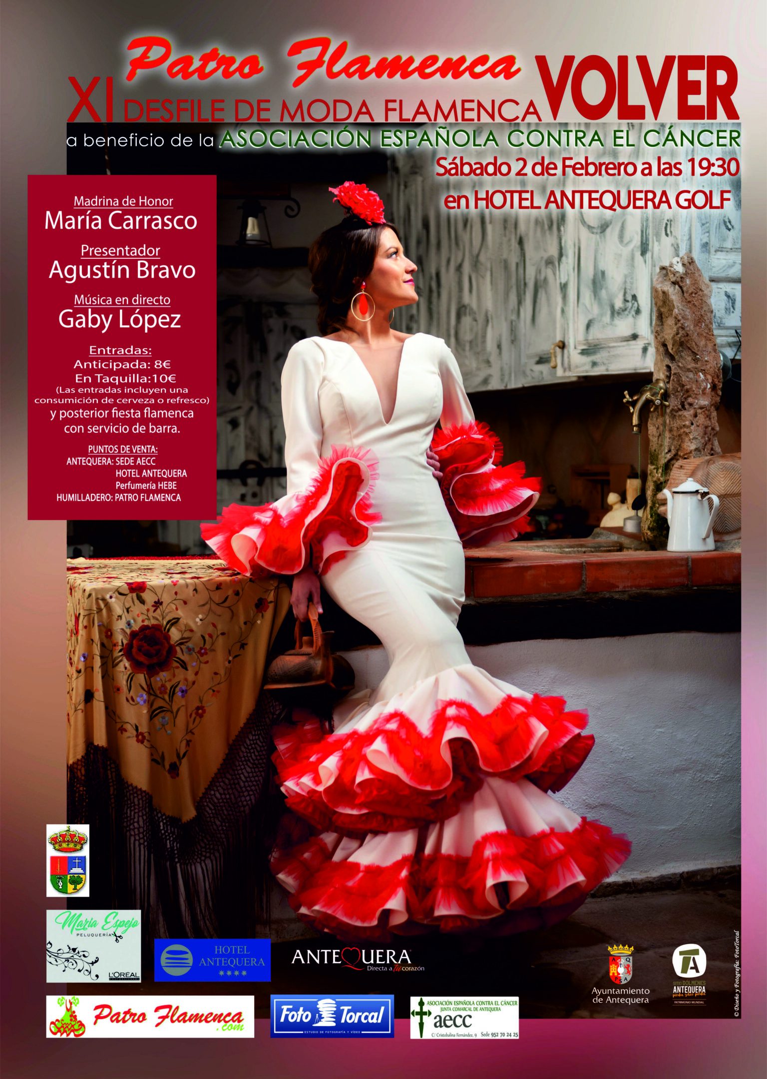 19.30 Desfile de Patro Flamenca “Volver” en el Hotel Antequera Golf. Con la actuación musical de Gaby Lopez presentado por Agustin Bravo. A beneficio de la AECC.  Madrina de honor: María Carrasco.