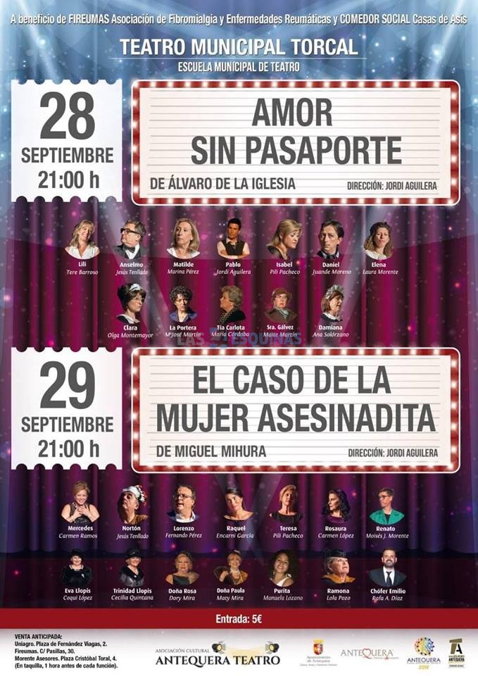 21.00 TEATRO “AMOR SIN PASAPORTE” Autor: Álvaro de la Iglesia A cargo de: Asociación Cultural Antequera Teatro – Escuela Municipal de Teatro A beneficio de: Fireumas Asociación de Fibromialgia y Enfermedades Reumáticas y Casa de Asís Comedor Social. Precio 5 euros.