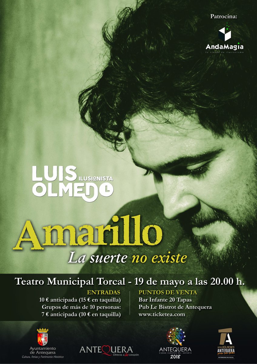 20.00 Espectaculo del ilusionista Luis Olmedo, “Amarillo, la suerte no existe”. Patrocina Andamagia. Venta de entradas anticipadas 10 euros en Bar Infante 20 Tapas y Pub Le Bistrot. Entrada en taquilla, 15 euros. Teatro Municipal Torcal.