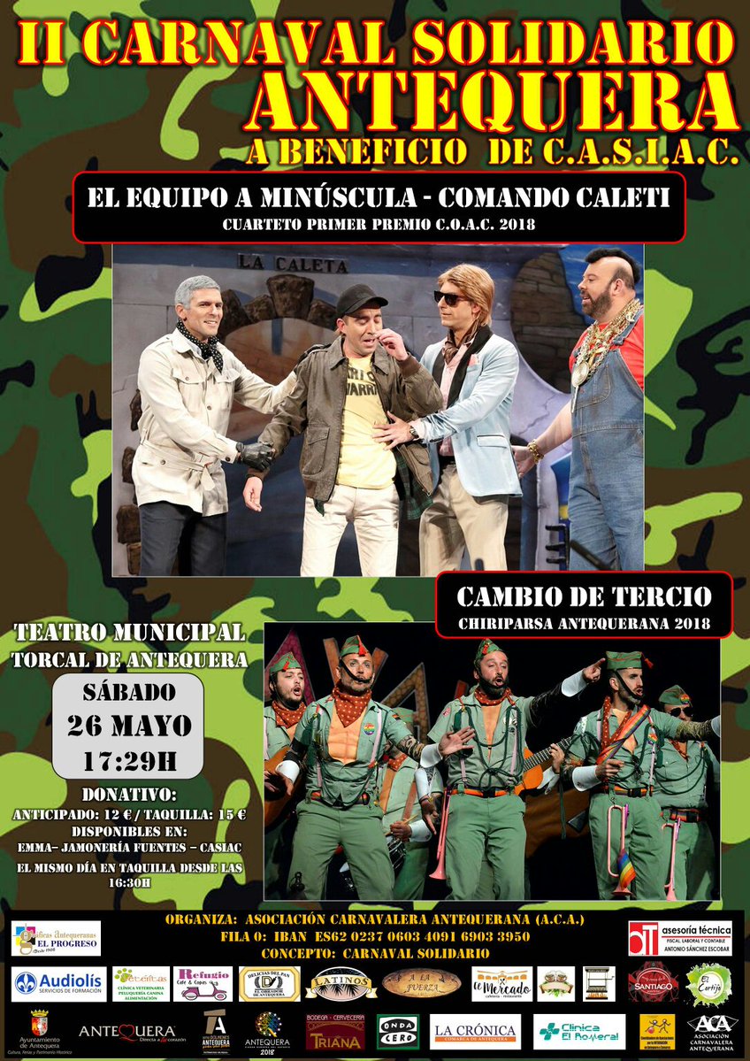 17.29 2º Carnaval Solidario de Antequera. Teatro Municipal Torcal. A beneficio de CASIAC. Con la actuación del Equipo A Minuscula – Comando Caleti. Cuarteto primer premio del COAC de Cadiz 2018. Y de la Chiriparsa Antequerana “Cambio de Tercio”.