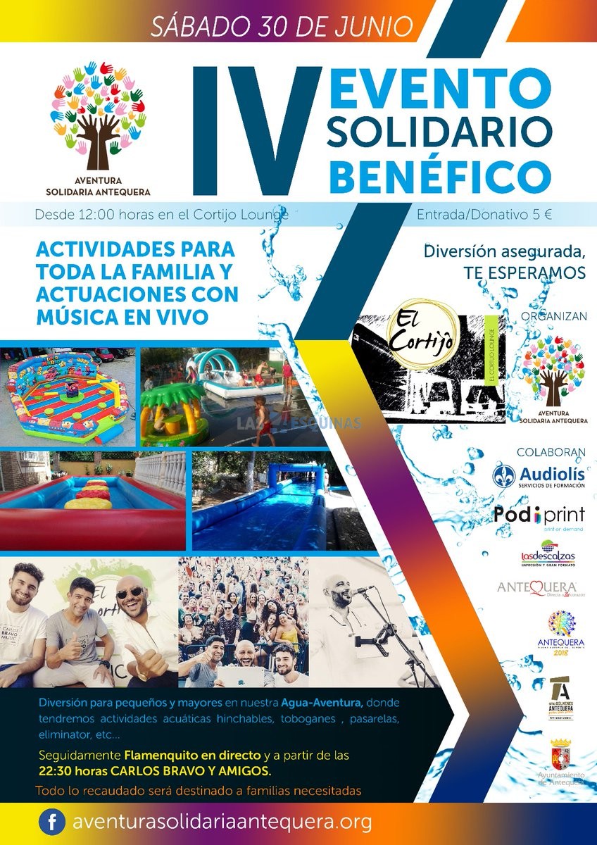Con Agua-Aventura con actividades hinchables, toboganes para pequeños y mayores y por la noche a partir de las 22.30 actuación de Carlos Bravo y Amigos. Todo lo recaudado irá destinado a familias necesitadas.