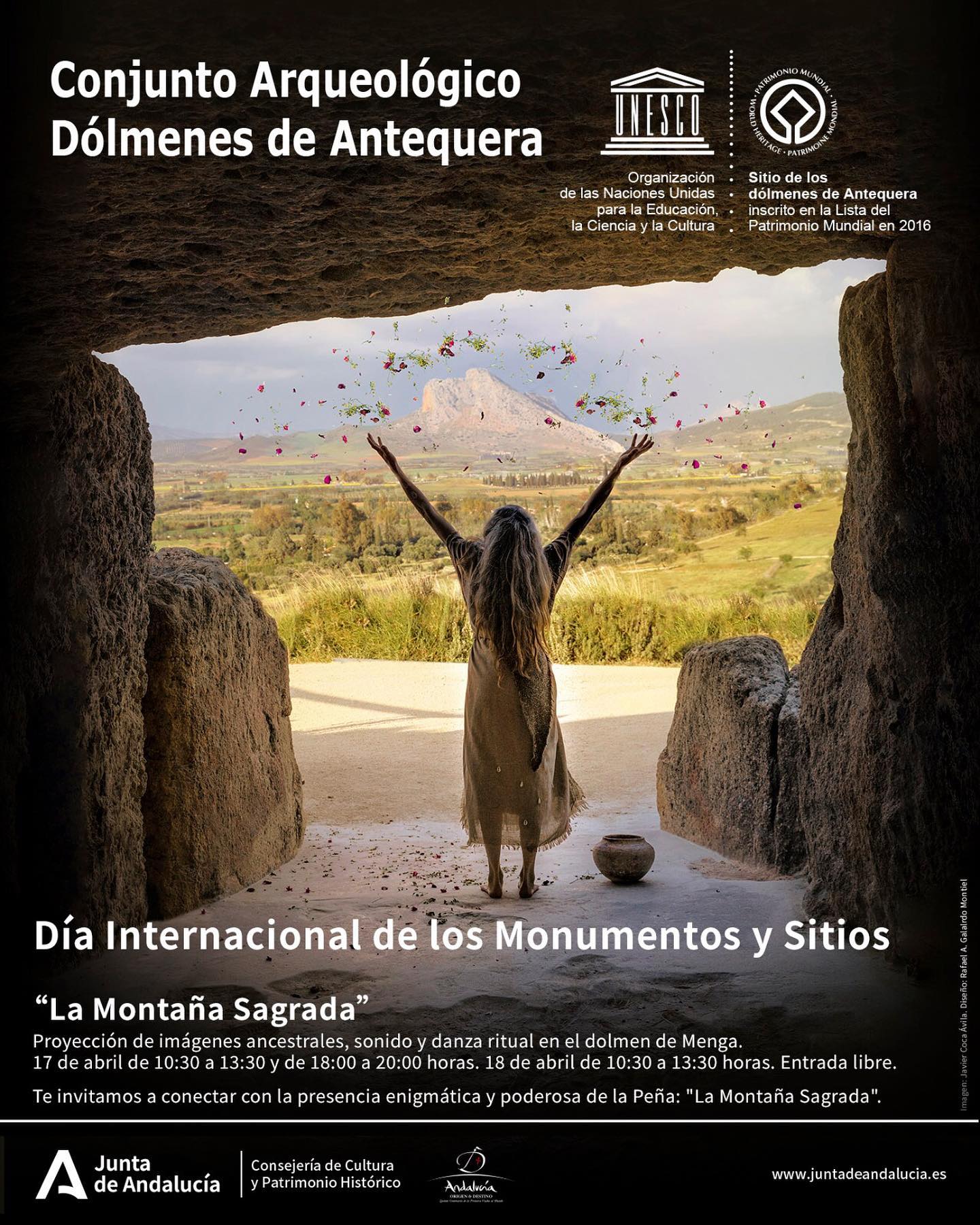 Con motivo este fin de semana del día internacional de los monumentos y sitios, este sábado de 10.30 a 13.30 y de 18.00 a 20.00, así como el domingo de 10.30 a 13.30 horas con entrada libre, se proyectarán imágenes ancestrales con sonido y danza en el DOLMEN DE MENGA.