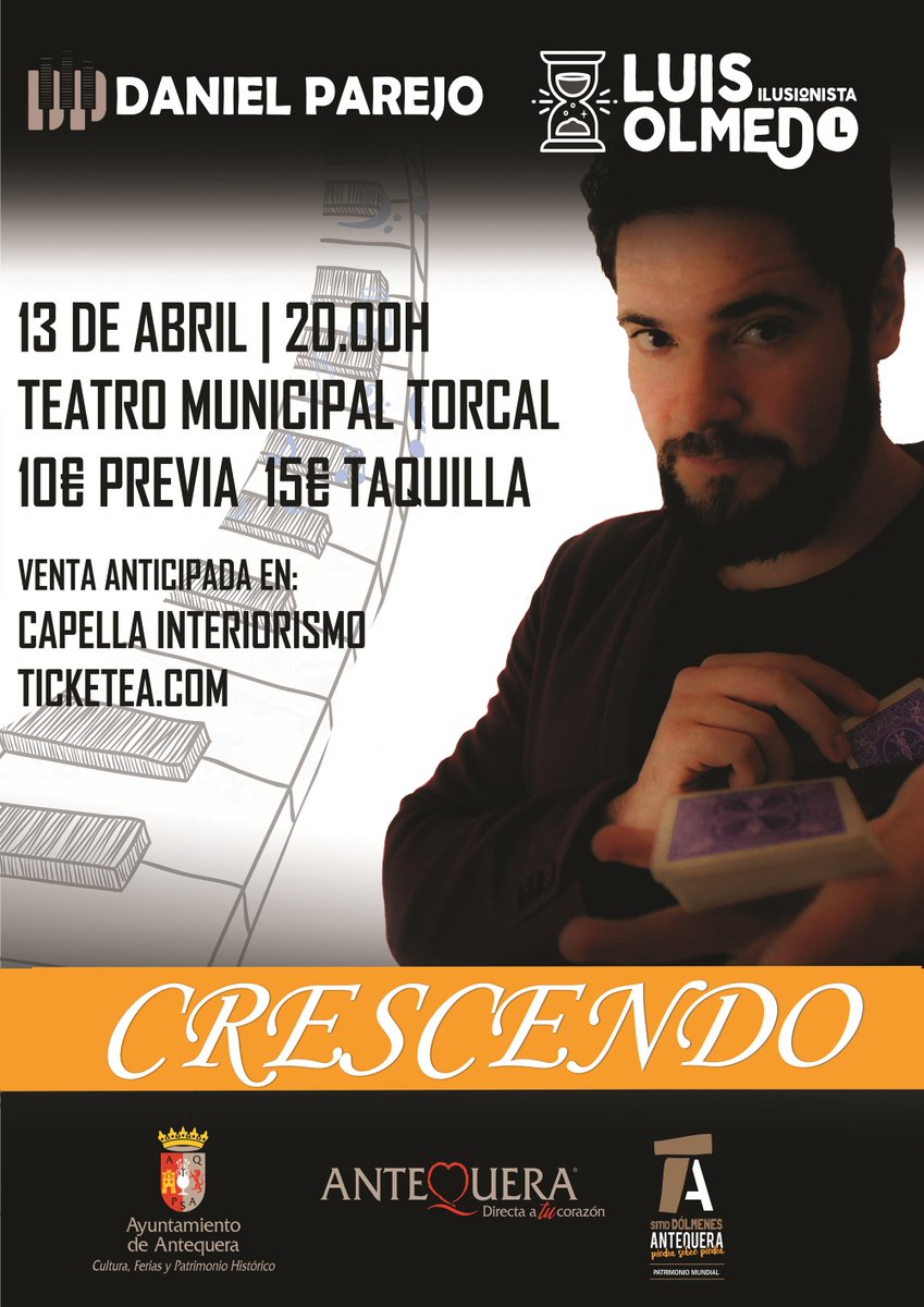 20.00 Espectaculo de Ilusionismo “Crescendo” con Daniel Parejo y Luis Olmedo. Teatro Municipal Torcal. Entrada previa a 10 euros, 15 euros en taquilla.