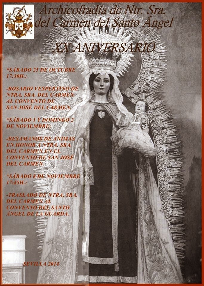 – A las 17:30 h, Traslado en Rosario Vespertino de la Virgen del Carmen del Santo Ángel, al Convento de San José del Carmen, conocido como de las Teresas, allí permanecerá donde el 1 y 2 de Noviembre estará en Besamanos hasta que el día 8 de Noviembre se traslado de nuevo al Convento del Santo Angel de la Guarda.