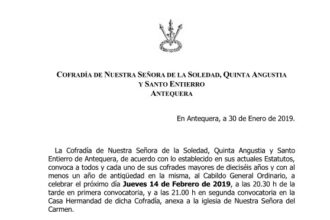 La Cofradía de la Soledad de Antequera convoca a sus hermanos a su Cabildo Ordinario de Salida