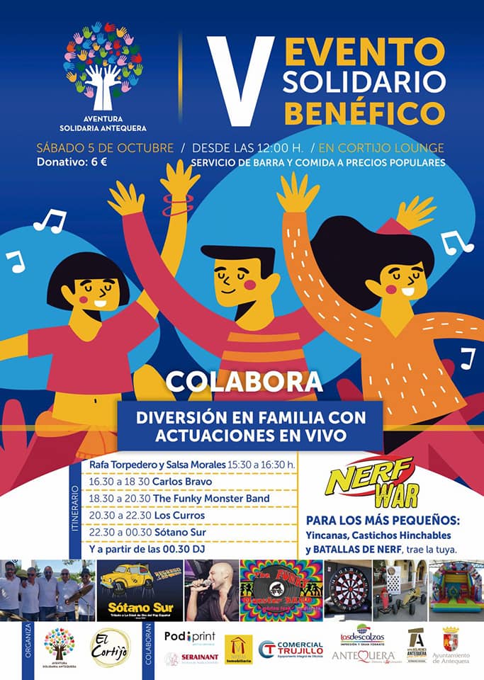 Fiesta Solidaria de Aventura Solidaria Antequera en El Cortijo Lounge. Entrada donativo 6 euros.
