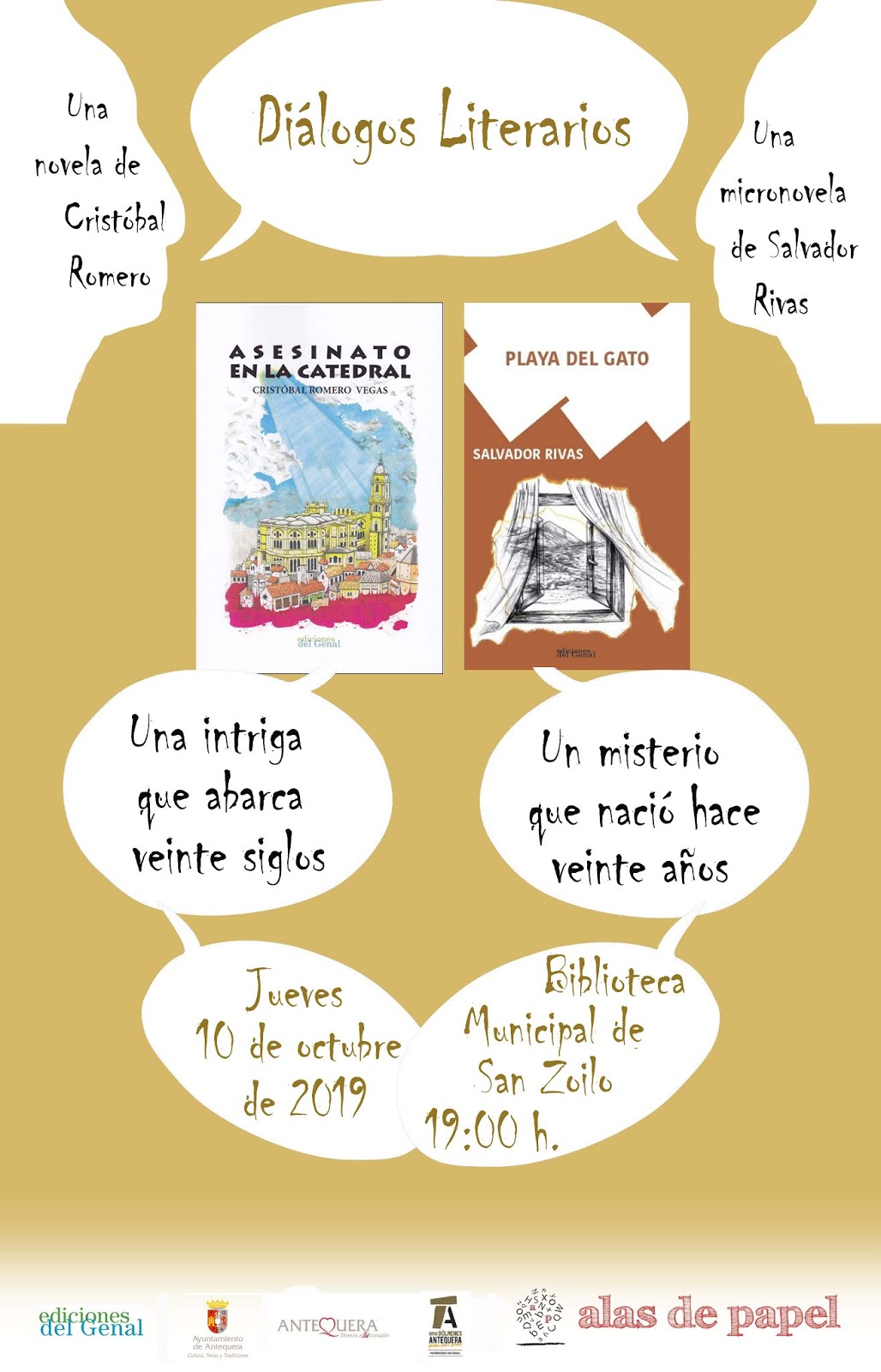 El colectivo literario Alas de Papel abrirá sus Diálogos Literarios con dos obras asociadas a la intriga y al género negro, ‘Asesinato en la catedral’, obra de Cristóbal Romero y ‘Playa del Gato’, micronovela escrita por Salvador Rivas. Esta actividad tendrá lugar en la Biblioteca Municipal de San Zoilo el 10 de octubre, a las siete de la tarde, con entrada libre hasta completar aforo.