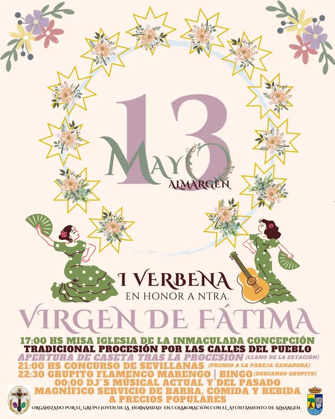 Almargen celebrará el próximo 13 de mayo la I Verbena en honor a la Virgen de Fátima. La festividad tendrá su inicio a las cinco de la tarde con la misa en la Iglesia de la Inmaculada Concepción que irá precedida de la procesión por las calles del pueblo.