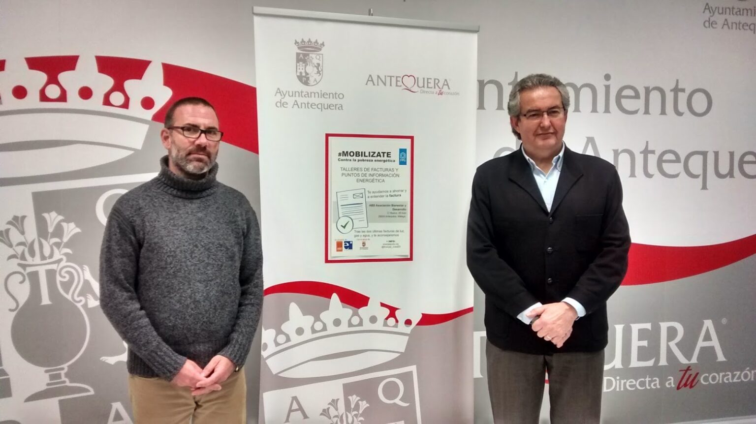 El concejal de Asuntos Sociales en el Ayuntamiento, José Luque y Claudio Vidal, coordinador en Antequera de la Asociación para el Bienestar y Desarrollo en Andalucía (ABD) han presentado la campaña ‘Movilízate contra la pobreza energética’ que busca, a través de la ubicación de varios puntos de información por el centro de la ciudad, informar a los ciudadanos para paliar la pobreza energética.