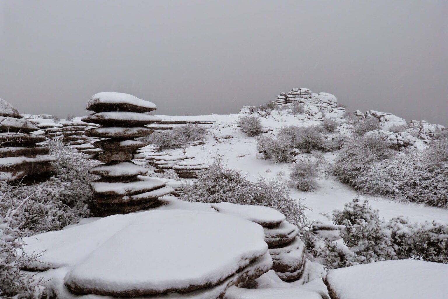 La carretera de las Pedrizas (A-45) también se vio sorprendida por la nieve, aunque no se necesitaron cadenas. Los copos comenzaron a caer en el Torcal de Antequera a las 15.00 horas cuando preveía la AEMET. Una hora y media después la nieve era tal que cubrió de un manto blanco el paraje natural lo que provocó el corte de la carretera que accede al mirador, quedando atrapados varios vehículos.