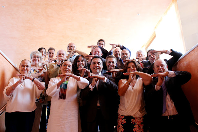 El retratista Antonio Montiel, y el responsable deportivo de la UMA, Pedro Montiel, junto con los invitados al ágape, apoyaron mediante el gesto de la campaña a la candidatura de los Dólmenes de Antequera a Patrimonio Mundial de la UNESCO.