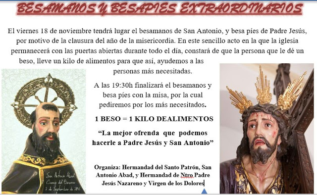 Este viernes tendrá lugar en la Parroquia de Cuevas del Becerro un besamanos extraordinario al Sagrado titular y Santo Patrón San Antonio Abad, acompañado del Sagrado Titular de la Pro Hermandad de Nuestro Padre Jesús Nazareno así como del Cristo del Santo Entierro. Juntos han organizado esta idea que con ella ayudaran a conseguir alimentos para los más necesitados.