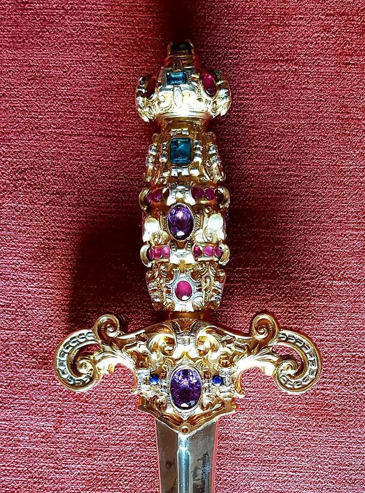 Además, también se ha presentado y bendecido una nueva daga para Nuestra Señora de la Paz. La obra ha sido ejecutada en el taller de Orfebrería Triana, resultando labrada en plata y oro, esmaltada y engastada con pedrería bajo dibujo de Javier Sánchez de los Reyes inspirado en el juego de armas ceremoniales con el que el rey Felipe II obsequió al Gran Maestre de la Soberana Orden de Malta.