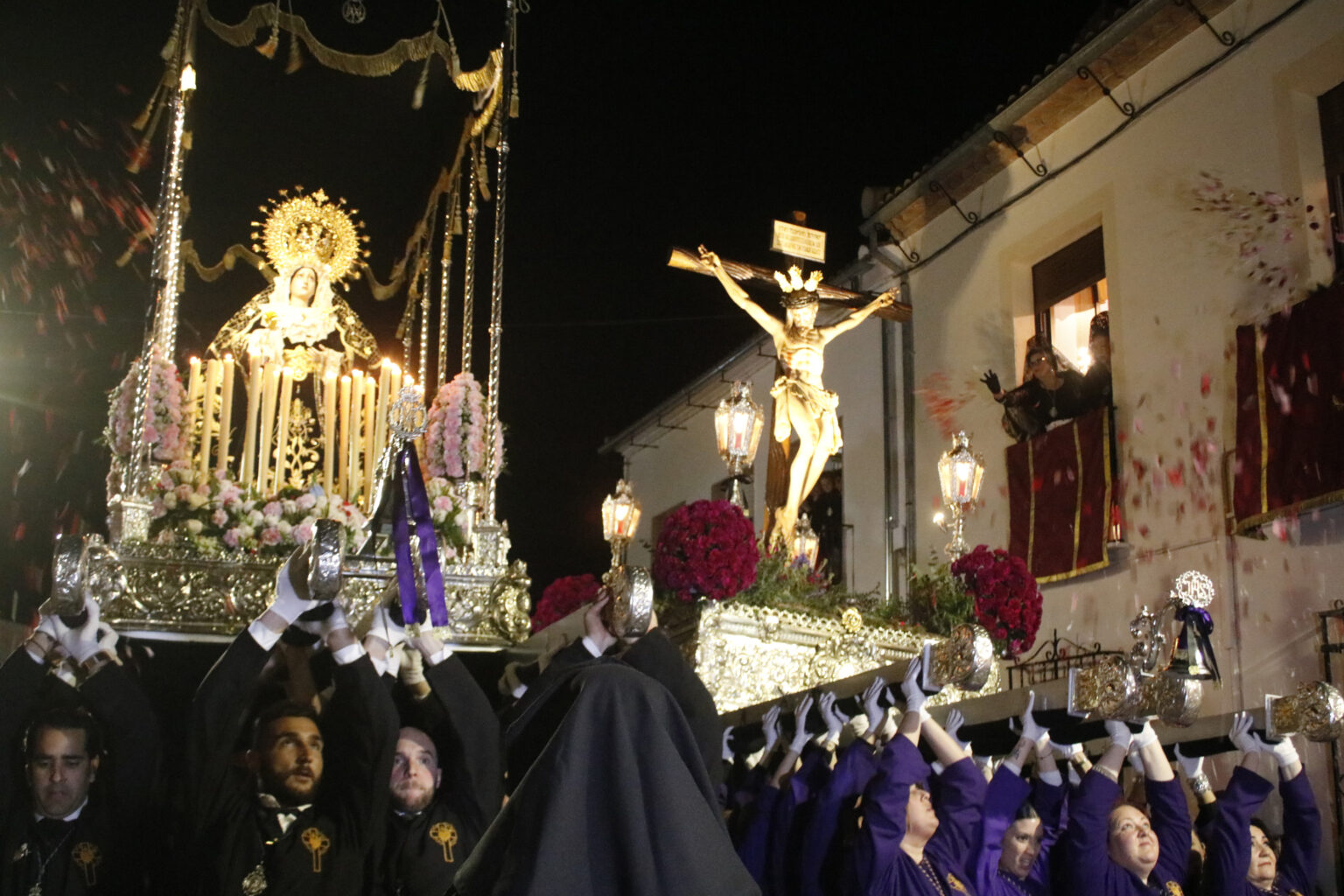 Otro de los momentos especiales de la noche llegó cuando los dos tronos, en plena calle Nueva se unen, y comienza a mecer a sus Sagradas Imágenes, como si pareciese un único trono. Llegado a mitad de la calle y con los balcones engalanados se produjo una gran petalada y cánticos a las imágenes.