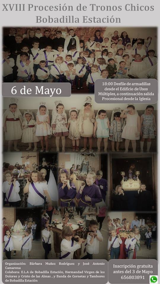 Bárbara Muñoz y Jose Antonio Camarena organizan la XVIII procesión de tronos chicos de Bobadilla Estación, la cual tendrá lugar este próximo sábado 6 de mayo a partir de las 18.00 horas.