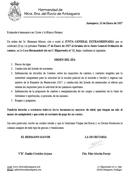 El Hermano Mayor de la Hermandad del Rocio de Antequera, Emilio Córdoba, cita a sus cofrades a Junta General Ordinaria de Cuentas que tendrá lugar este viernes 27 de enero a las 20.30 horas en primera convocatoria y a las 21.00 horas, en segunda convocatoria.