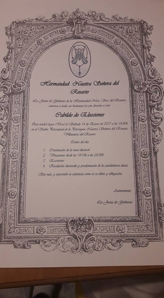 El sábado 14 de enero la hermandad patronal de Nuestra Señora del Rosario de Villanueva del Rosario, celebrará cabildo de elecciones en el salón parroquial donde se elegirá la nueva junta de gobierno que regirá la institución durante los próximos cuatro años.