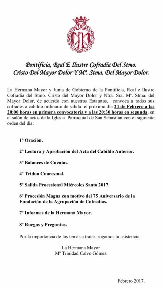 La Hermana Mayor y Junta de Gobierno de la Pontificia, Real e Ilustre Cofradía del Santísimo Cristo del Mayor Dolor y Nuestra Señora del Mayor Dolor de acuerdo con nuestros Estatutos, convoca a todos los cofrades a cabildo ordinario de salida que tendrá lugar el viernes 24 de febrero a las 20.00 horas en primera convocatoria y a las 20.30 horas en segunda, en el salón de actos de la Iglesia Parroquial de San Sebastián con el siguiente orden del día: