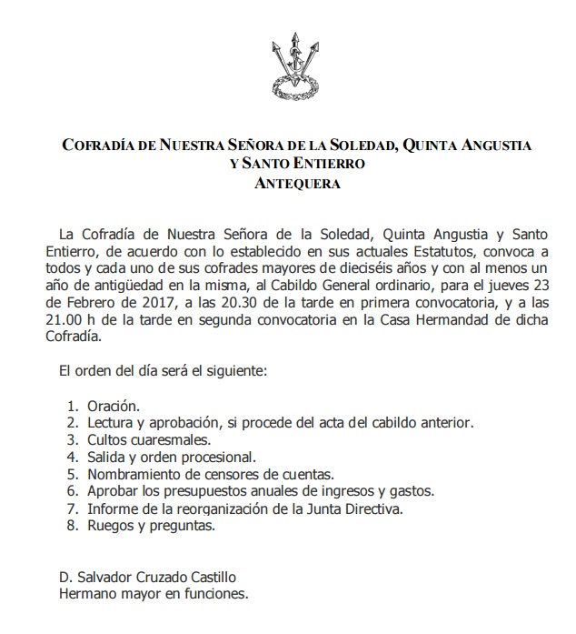 La Cofradía de Nuestra Señora de la Soledad, Quinta Angustia y Santo Entierro de Antequera, de acuerdo con lo establecido en sus actuales Estatutos, convoca a todos y cada uno de sus cofrades mayores de dieciséis años y con al menos un año de antigüedad en la misma.