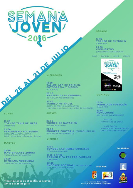 Campillos celebrará su ‘Semana Joven 2016’ del 25 al 31 de julio. La actividad está organizada por el Centro Juvenil Camjoven, junto con la Concejalía de Juventud y Deportes, Guadalinfo Campillos, Protección Civil Campillos y Radio Campillos.