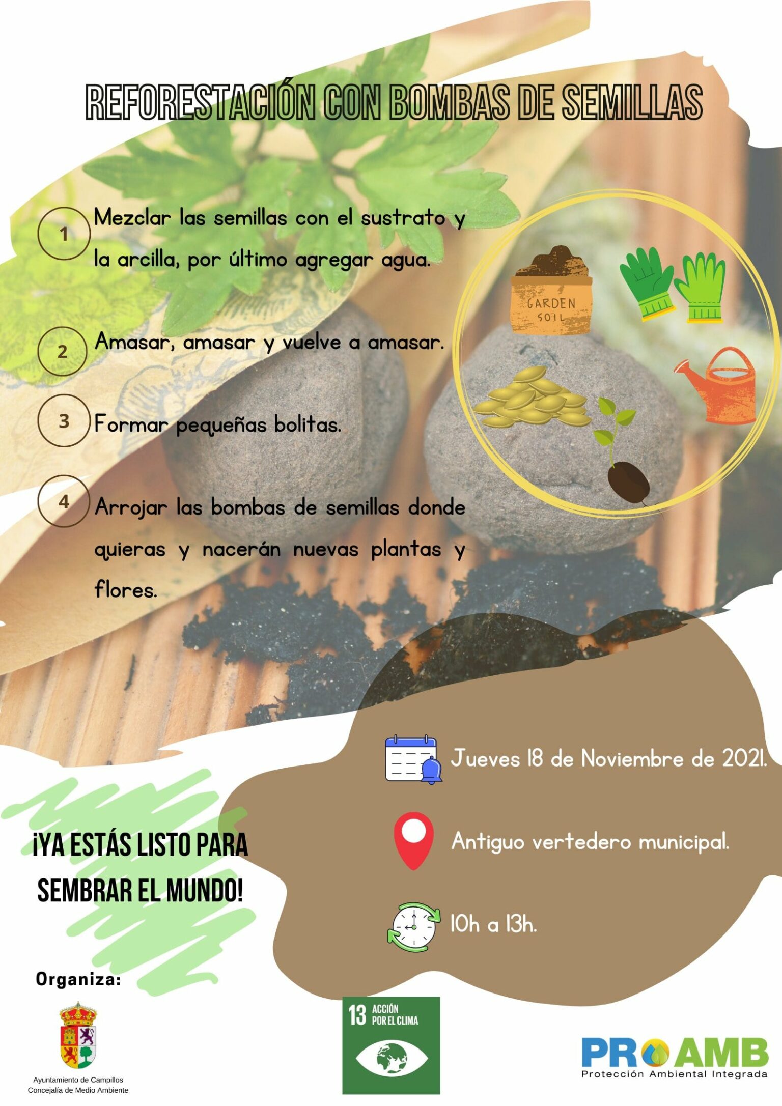 El V Programa Anual de Educación Ambiental del Ayuntamiento de Campillos acogerá una nueva actividad este mes de noviembre. En este caso, la campaña versará sobre la reforestación con bombas de semillas y se desarrollará en consonancia con los Objetivos de Desarrollo Sostenible (ODS) números 11 (ciudades y comunidades sostenibles) y 13 (acción por el clima).
