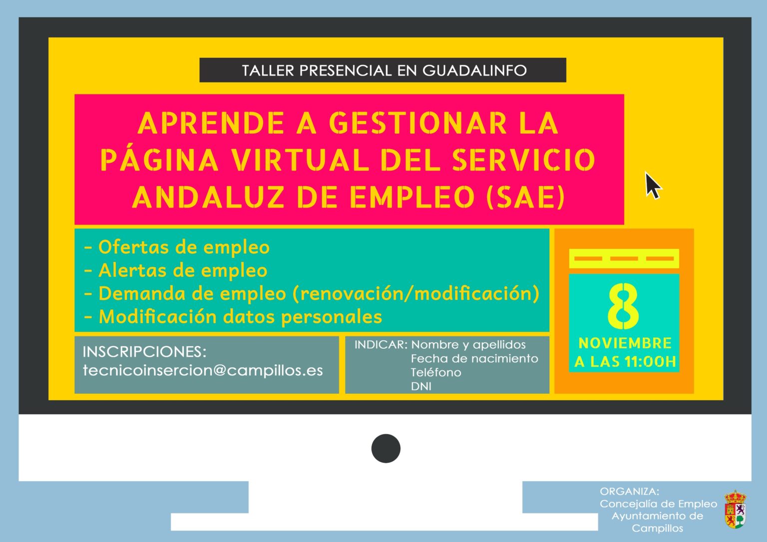 A través de este taller se pretende enseñar a las personas que demandan un puesto de trabajo a gestionar su perfil en la página virtual del SAE. Así, se abordarán tareas como la búsqueda e inscripción en ofertas de empleo, la creación de alertas de empleo, la renovación o modificación de la demanda de empleo, la modificación de datos personales y la elaboración y actualización del currículum vitae.