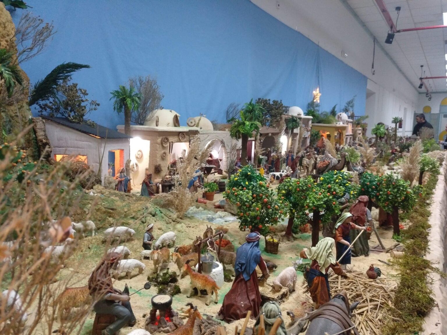 A) Dos imágenes sobre la vista frontal general del belén, independientemente de si se trata de un diorama o un belén abierto.