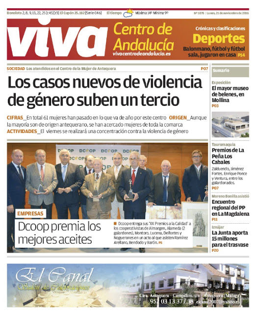 En total 61 mujeres han pasado en lo que va de año por este centro , aunque la mayoría son de origen antequerano, se han acercado mujeres de toda la comarca. Dcoop premia los mejores aceites, entrega sus premios ‘XX Premios a la Calidad a los cooperativistas de Almargen, Alameda, Montoro o Lucena. Entre otras noticias puedes encontrar el mayor museo de belenes, en Mollina; los premios de La Peña de Los Cabales; el encuentro regional del PP en La Magdalena.
