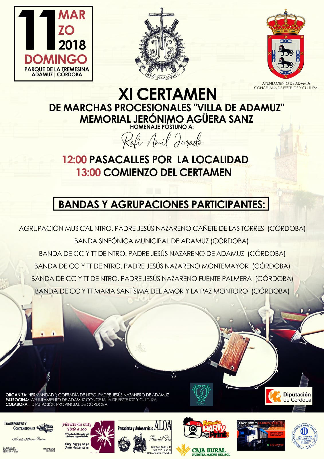 Se trata del úndecimo certamen de marchas “Villa de Adamuz”, Memorial Jerónimo Aguera Sanz, homenaje póstumo a Rafi A. Jurado organizado por la Hermandad de Nuestro Padre Jesús Nazareno de Adamuz.