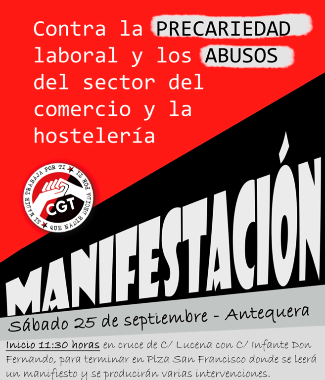 CGT apuesta por Andalucía y en concreto por su centro geográfico en Antequera para la celebración de sus próximos comicios orgánicos de Comercio, hostelería y del sector ferroviario, para dar un impulso a su implantación territorial fuera de las capitales de provincia y apostando por las cabeceras de comarca y el medio rural en general. El sábado 25, a partir de las 11,30h está previsto atender a los medios de comunicación en la confluencia de C/ Lucena con C/ Infante Don Fernando, previamente a la celebración de una manifestación denunciando la precariedad y los abusos empresariales en ambos sectores de producción.