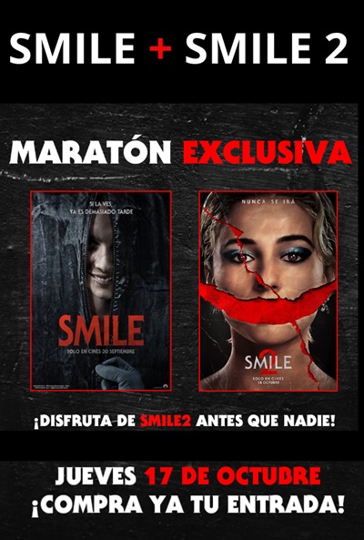 La sala celebrará un maratón con la proyección de las dos películas de la popular saga ‘Smile’. En primer lugar, se podrá disfrutar de la primera parte de ‘Smile’ y a continuación, los asistentes tendrán el privilegio de ser los primeros en ver el preestreno exclusivo de ‘Smile 2’, cuyo estreno oficial será al día siguiente, el viernes 18 de octubre.