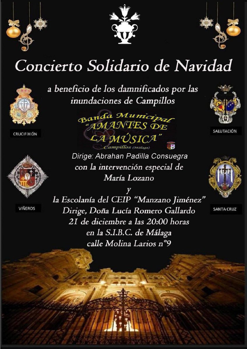 Las Hermandades de Crucifixión, Viñeros, Salutación y Santa Cruz de Málaga organizan concierto solidario de Navidad a beneficio de los damnificados por las inundaciones de Campillos.