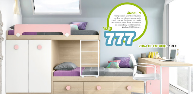 Composición juvenil compuesta por tren con dos camas, armario con 2 puertas, 3 cajones y zona de estudio con arcón. Gran posibilidad de acabados y combinaciones.