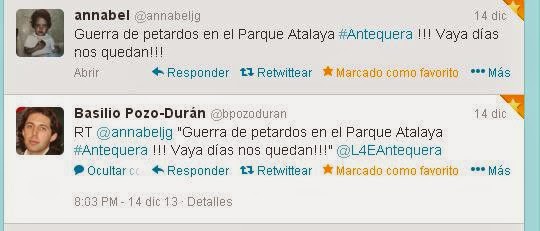 Esta semana nos llegaban los mensajes a twitter de Anabel y Basilio Pozo Durán que se quejaban por la guerra de petardos que había tenido lugar durante esa jornada en el Parque Atalaya de Antequera.