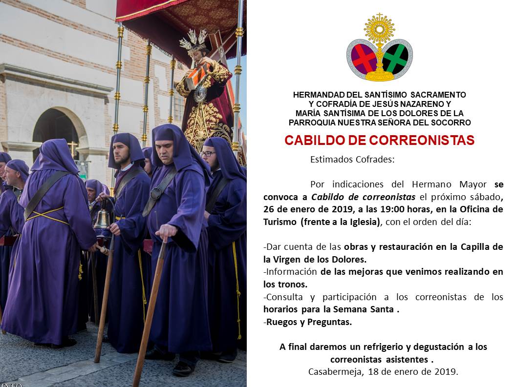 Por indicaciones del Hermano Mayor de la Hermandad del Santísimo Sacramento y Cofradía de Jesús Nazareno de Casabermeja, convocan a Cabildo a sus correonistas el próximo sábado, 26 de enero de 2019, a las 19:00 horas, en la Oficina de Turismo (frente a la Iglesia), con el orden del día: