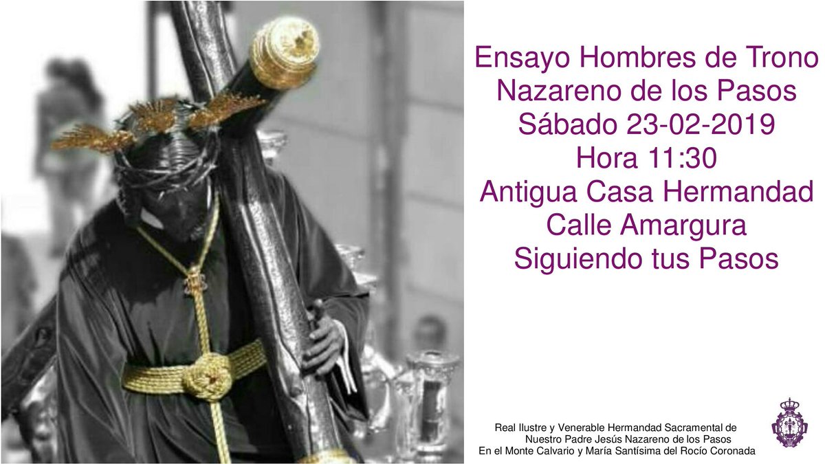 La Hermandad Sacramental de Nuestro Padre Jesús Nazareno de los Pasos en el Monte Calvario y María Santísima del Rocío Coronada de Málaga organiza ensayo de hombres de trono del Nazareno de los Pasos el próximo sábado 23 de febrero a las 11.30 horas en la antigua Casa Hermandad ubicada en Calle Amargura.