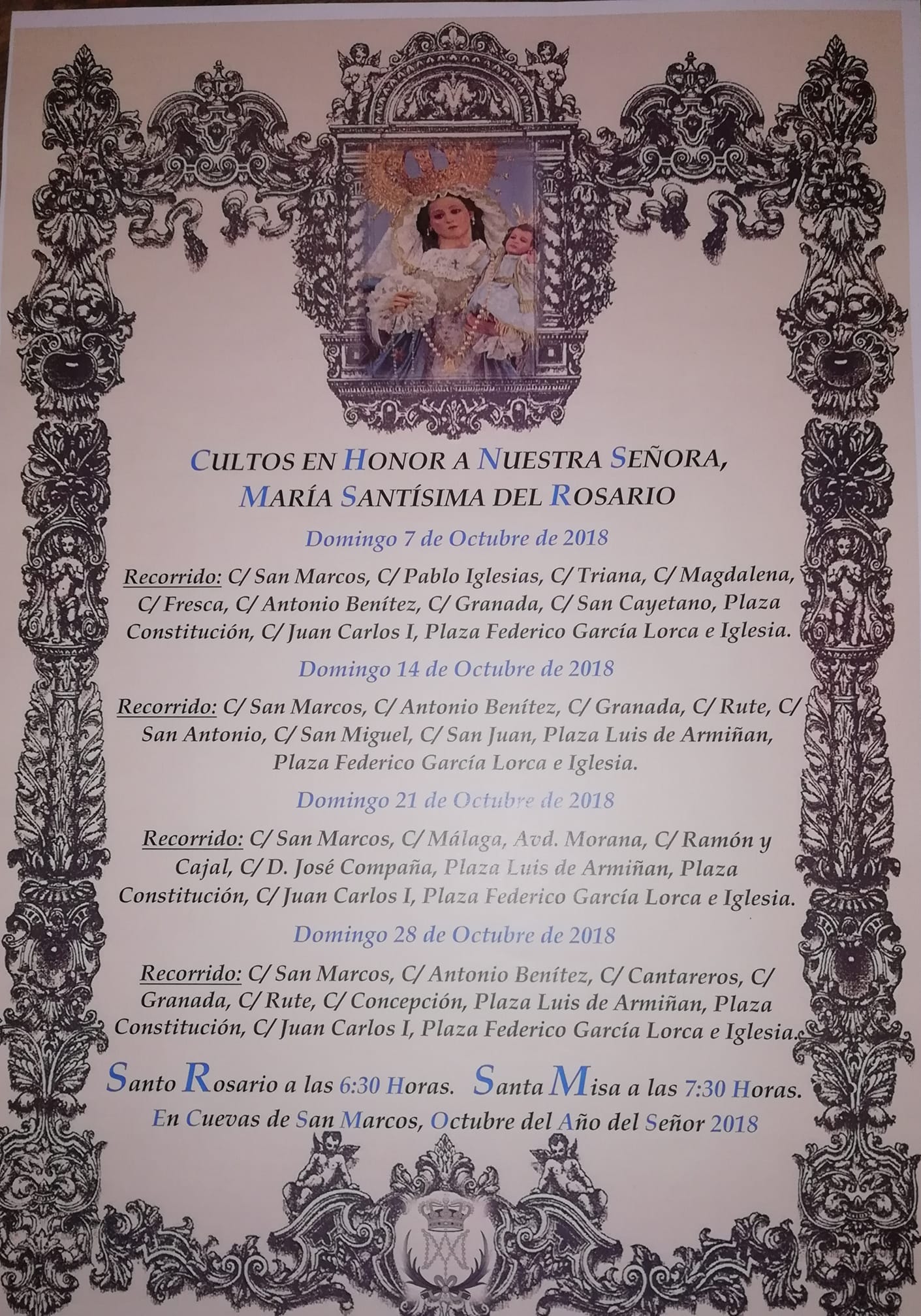 El pasado domingo 7 de octubre comenzaban los cultos en honor a la Virgen del Rosario recorriendo algunas calles de la feligresía, los Auroros de Nuestra Señora del Rosario seguirán realizando sus oraciones hechas canción con el siguiente orden de domingos del presente mes de octubre, como marca su tradición: