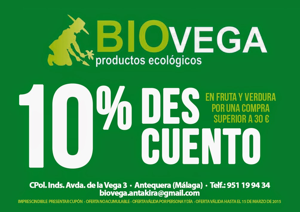 Biovega te hace un 10 % de descuento en fruta y verdura por una compra superior a 30 €.