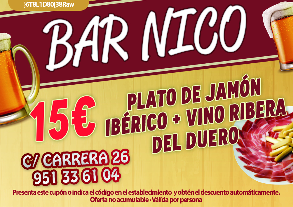 Pide con este cupón descuento un plato de jamón ibérico + vino Ribera del Duero en Bar Nico y sólo te costará 15€