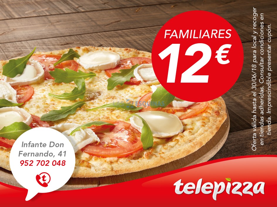 PizzasPizzas familiares por 12€ para local y recoger en tiendas Telepizza adheridas. Consultar condiciones en tienda. Imprescindible presentar cupón.
