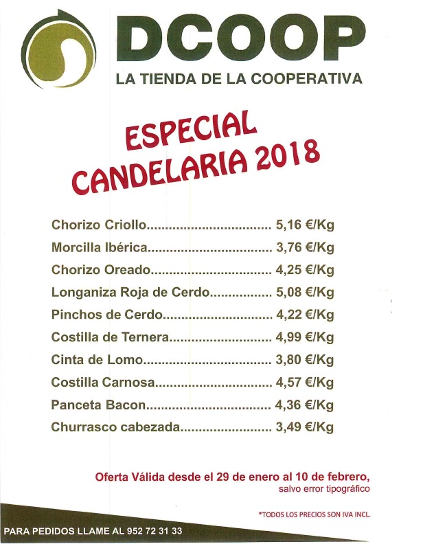 La marca Dcoop quiere celebrar las fiestas de La Candelaria con sus clientes y para ello lanza una serie de ofertas en su amplia gama de productos. Ofertas que estarán hasta el próximo 10 de enero. Recordar que para cualquier pedido tiene también a su disposición el número 952 72 31 33.