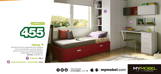 Dormitorio juvenil compuesto por compacto con 2 contenedores, zona de estudio y armario de rincón con estantería terminal. Disponible en otros acabados.