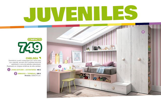 Dormitorio juvenil compuesto por compacto compuesto por cama nido con cajones, armario de 2 puertas + terminal estantería y zona de estudio + estantería. Realizado en chapas sintéticas de alta calidad.