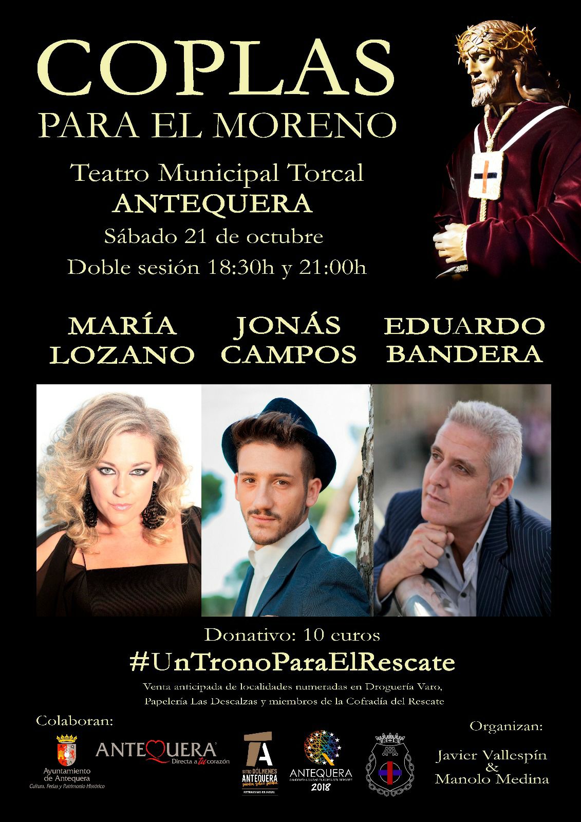 Este sábado 21 de octubre tendrá lugar en el Teatro Municipal Torcal la primera edición del duelo ‘Coplas para el Moreno’ a beneficio de #UnTronoParaElRescate que en esta ocasión contará con la presencia de los artistas María Lozano, Jonás Campos y Eduardo Bandera.