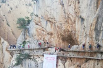 Una lona gigante en el Caminito del Rey con motivo del Día Mundial contra el Cáncer de Mama